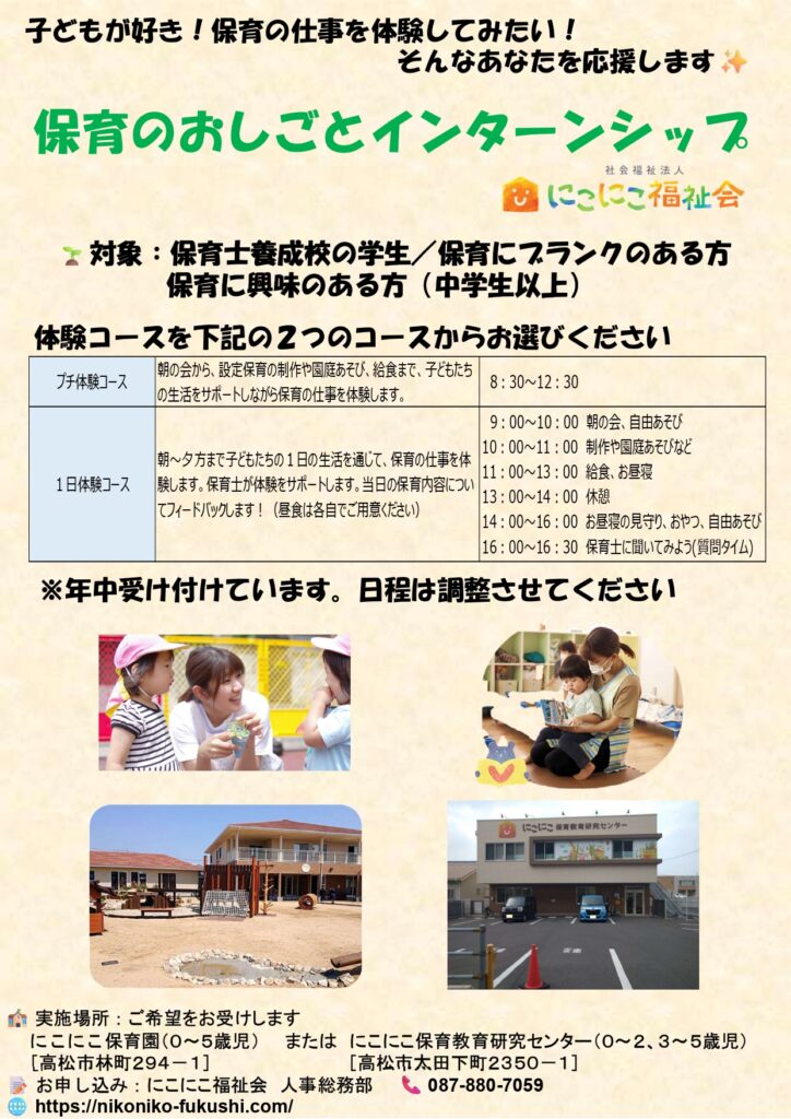 当園では、そんな想いを持つ方を対象とした「インターンシップ」を随時受け付けています。 資格の有無や経験の長さは問いません。まずは「子どもが好き」という気持ちだけを持って、遊びに来ませんか?