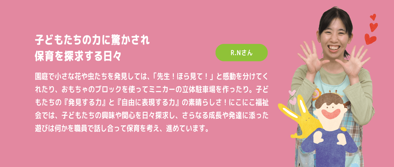 今後も今まで以上に子どものその時の心持ちに寄り添った保育と、子育て支援につながる保護者の方とのやりとりを大切にしていきたいです。
